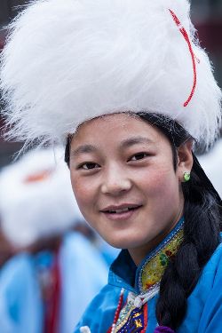 藏裝的基本特點是長袖、寬腰、大襟、肥大。直線寬邊,色彩對比強烈。男女藏袍均習慣以粗紡厚毛呢為料,左襟大,右襟小,一般在右腋下釘一個紐扣,或是用紅、藍、綠、雪青等色布做兩條飄帶,穿時結上。男式藏袍多為黑、白兩色,領圍、袖口、衣襟和底邊,鑲上色布或綢子底邊,古樸渾厚。夏天或勞動時,一般只穿左袖,右袖從后面拉到胸前搭在左肩上,也可左右袖均不穿,兩袖束在腰間,古銅色的皮膚袒露于外,雄風凜凜,彪悍剛健。女式藏袍,分有袖和無袖的兩種,夏秋兩季的藏袍無袖。里面多襯有紅、綠等色彩鮮艷的襯衣,襯衣翻領在外,衣袖要長于胳膊一至二倍,長出部分,平時卷起,舞蹈時放下,舒展飄逸,瀟灑自如。藏族的帽子式樣繁多,各地均有不同,拉薩等地以金寶頂帽為最多,用金絲或銀絲繡織圖案,在陽光照耀下,閃閃發(fā)光。金花帽是男女老幼都喜歡戴的民族帽。男女穿的藏靴,底高二寸,靴腰高至小腿以上,靴面用紅綠相間的毛呢裝飾,繡有圖案花紋。靴頭向上隆起。藏族男女喜歡佩飾。耳穿大環(huán),手腕金銀,頂戴珠鏈,尤其是在腰間,男挎長劍,女佩腰刀,更顯得粗獷彪美。