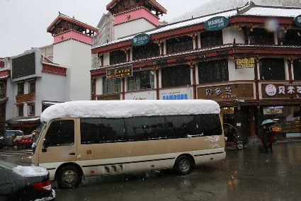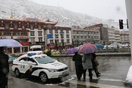 當(dāng)天,記者來(lái)到康定城區(qū),一路上看到,從新城下來(lái)的車輛,有的車頂上都頂上了20公分左右的“雪帽”了。