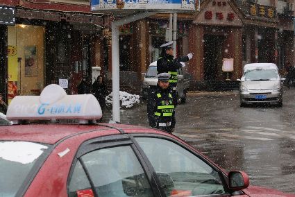 在將軍橋,為方便車輛順利通行,三名交警們一大早就上崗了。雖然雪仍然下著,但交警站在指揮臺(tái)上,認(rèn)真指揮著過(guò)往車輛。