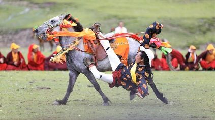 7月23日,四川甘孜藏族自治州理塘縣村戈鄉(xiāng)賽馬活動(dòng)開(kāi)始,牧民們?cè)隈R背上一顯身手。每年藏歷六月,當(dāng)草原上格桑花盛開(kāi)的時(shí)候,四川省理塘縣24個(gè)鄉(xiāng)(鎮(zhèn))就會(huì)按照習(xí)俗舉辦隆重的賽馬會(huì)來(lái)拜祭神山,慶祝豐收。迄今有400多年歷史的賽馬分為耐力賽、小走賽、馬術(shù)賽等,其中最為精彩的是馬術(shù)賽:馬肚藏身、馬背倒立、飛騎射擊、拾哈達(dá)等,驚險(xiǎn)刺激。2008年6月,此項(xiàng)活動(dòng)被列入四川省級(jí)非物質(zhì)文化遺產(chǎn)保護(hù)項(xiàng)目。(朱虹 葉強(qiáng)平)