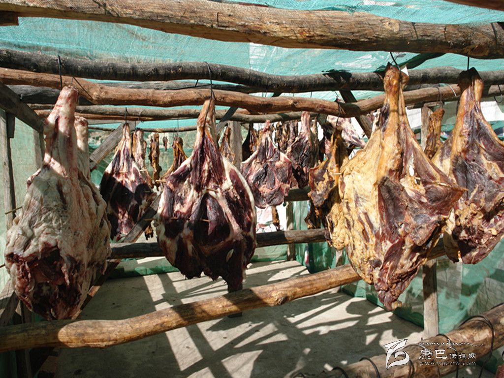 丹巴嘉絨藏族年期間,在酸菜包子、火燒饃、香豬腿等眾多的風味飲食中,“藏香豬腿”是必不可缺的美食佳肴,也是給長輩拜年和親朋好友間互送的最佳禮品。“藏香豬腿”的制作方式也象丹巴嘉絨藏族年一樣的獨特。丹巴人宰殺年豬的方式通常有用繩索死吊或者用刀從勁入殺心臟致死兩種,現(xiàn)在采用后一種方式宰殺豬居多。當?shù)厝藢⒇i宰殺后用熱水燙,處理好豬毛,再在胸口用刀開一孔,將手伸人胸腔扯斷心肺連接處,然后將其剖開,并把肥、瘦豬肉分離開,剝?nèi)グ逵?,處理好其他?nèi)臟,將豬腿按原形分離,爾后經(jīng)霜凍、柏枝熏、自然風干后存放在儲藏室內(nèi)。豬腿存放一冬后,色、香、味俱佳。食用時煮成半熟或用炭火將表皮烘烤,切成小塊狀或撕成粉絲狀,在百米內(nèi)即可聞到香味,入口鮮嫩清香,營養(yǎng)豐富,誘人食欲。