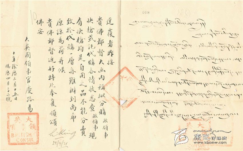 可以肯定的是,這就是給某位活佛的復(fù)信,除了稱呼佛都督(這是在當(dāng)時對活佛的通行的敬稱)可以看出外,還有藏文可以佐證。這張紙片上寫道:昨接貴佛都督大函,內(nèi)稱,擬分購敝領(lǐng)事館快槍或托代購各情敬悉。查敝領(lǐng)事現(xiàn)有快槍均是自用之品,不能分賣。致于代購一層,亦難辦到,尚希原諒為荷,并候貴佛都督近好,特此奉復(fù),順頌佛安。署名是大英國領(lǐng)事館官慶路易,日期為十年陰歷三月十五日,陽歷四月二十二日。在公章下面注有公元1922年4月22日。