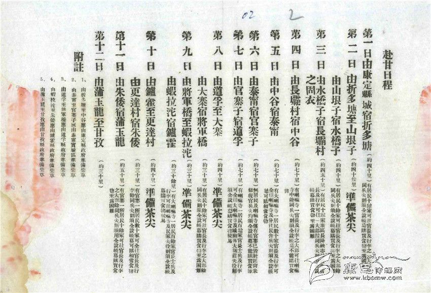 為了安排好戴院長一行的行程,西康建省委員會專門發(fā)出了一份“訓令”。這份時間表就是根據(jù)“訓令”要求為戴院長行程作出的安排。每天從何地到達何地,里程多少,休息地有無村莊、寺廟,接待力量如何、是進房屋休息還是支帳篷都有說明,而且對沿途各縣各地提出了包括應準備柴草、應在哪些地方準備“打尖茶”(午飯)等具體要求。