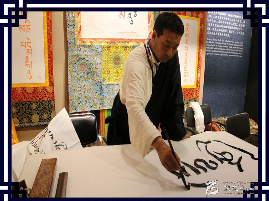 在藏文書法展示區(qū),來自甘孜縣的藏文書法家巴桑鄧珠正在為前來參觀的群眾展示書法技藝,巴桑鄧珠瀟灑地拿著藏文書法專用的排筆上下?lián)]舞,不一會(huì)白紙上便呈現(xiàn)出清秀的藏文書法。