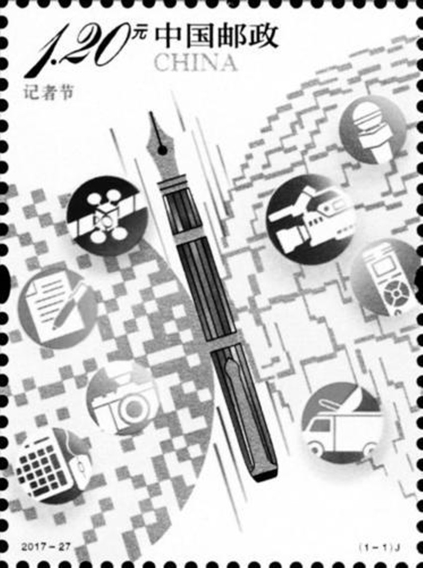 為紀念第18個記者節(jié)。中國郵政定于2017118日發(fā)行《記者節(jié)》紀念郵票一套1枚。郵票圖案采用了具有現(xiàn)代感的構(gòu)成手法及色彩表達方式。畫面中的鋼筆象征了記者秉持弘揚民族精神、維護國家利益和社會責任的專業(yè)精神和自信風范。兩側(cè)的線條及方點構(gòu)成的兩個圓形圖案分別隱喻地球和現(xiàn)代網(wǎng)絡體系,表示在新媒體時代,新聞傳播媒介所呈現(xiàn)出的多元化、全球化的發(fā)展態(tài)勢。畫面中麥克風、攝像機、錄音筆等形式各異的采編設(shè)備圖標,結(jié)合衛(wèi)星及地面發(fā)射站等元素,突出了當代記者巨大的社會影響力。同時,鋼筆和兩側(cè)的圓形圖案共同組成了一只振翅飛翔的蝴蝶形象,喻意了記者追求至善至美,在探訪報道中擔負著傳播先進文化,引領(lǐng)和維護和諧社會,推動人類文明的崇高使命和社會責任。