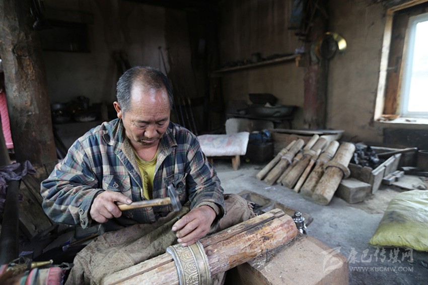 尼瑪師傅介紹到,鏨花完成后的藏刀殼還要經(jīng)過打磨拋光、去污、點(diǎn)藍(lán)上翠等工序后,藏刀殼才算制作完成。整個(gè)藏刀在打造中,必須要專心致志、全神貫注,數(shù)萬次的錘打才能完成一件純手工作品,制作一把手工藏刀是一件耗工時(shí),耗體力的工作,沒有定力的人是打造不出一件完美的作品。