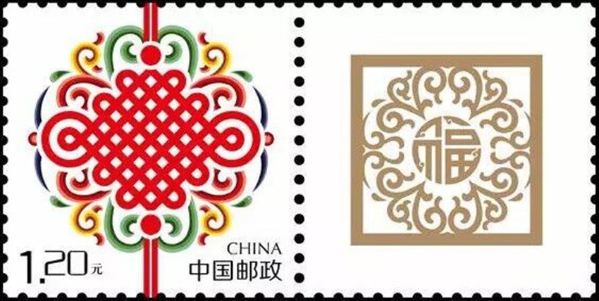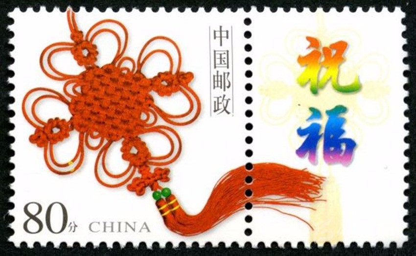 2002年5月10日,中國郵政發(fā)行《如意》個性化服務(wù)專用郵票一枚。主票圖案為如意柄端系著一個紅色“中國結(jié)”,附票有“祝?!倍郑?2003年3月3日,中國郵政發(fā)行《同心結(jié)》個性化服務(wù)專用郵票一枚。主票圖案為盤長結(jié)4邊編織有心型繩結(jié)的同心結(jié),附票為“祝?!倍?;2006年9月25日,中國郵政發(fā)行《中華全國歸國華僑聯(lián)合會成立五十周年》紀念郵票一枚。圖案為阿拉伯數(shù)字“5”與中華全國歸國華僑聯(lián)合會圓形會徽組成數(shù)字“50”,象征全國僑聯(lián)五十周年,背景畫面為淡淡的粉紅色“中國結(jié)”。寓意歸國華僑與全國人民血肉相連,同心同德共同建設(shè)美好家園;2013年8月8日,中國郵政發(fā)行一枚《美好祝福》賀卡專用郵票,圖案為象征喜慶的紅色“中國結(jié)”;2014年9月20日,中國郵政發(fā)行《中國夢(二)——民族振興》特種郵票,其中第四枚“民族團結(jié)”,圖案中載歌載舞的各民族群眾上方有一個大紅的“中國結(jié)”,象征著各民族大團結(jié)。