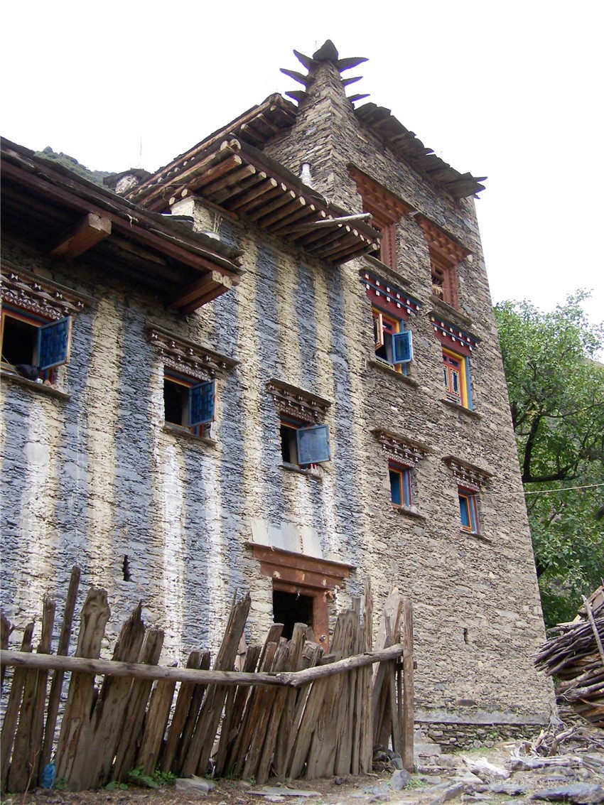 道孚扎壩碉房墻上刷有藍白相間的條紋。2006年攝
