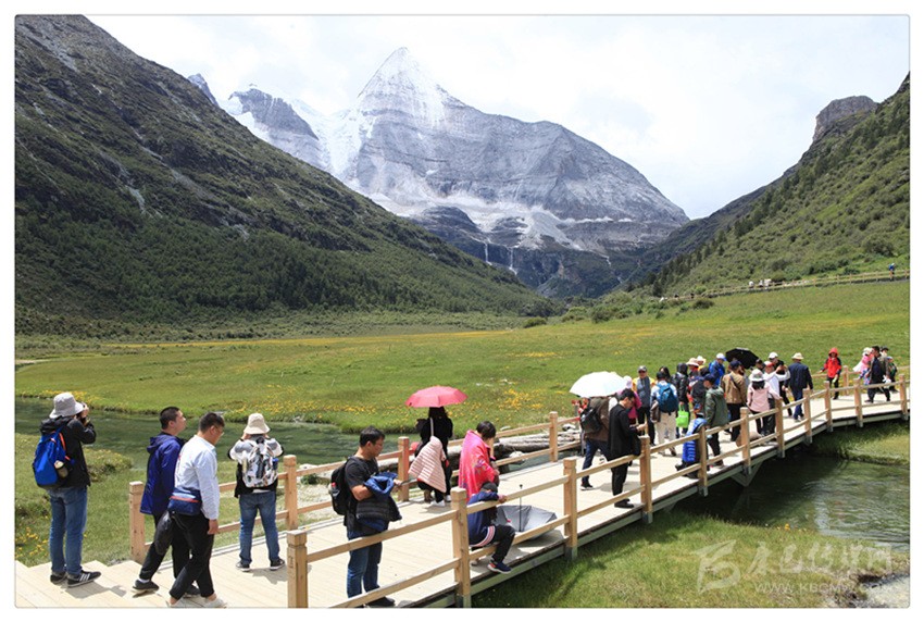 沒想到從景區(qū)的接駁車上一下來,第一眼看到的雪山就是仙乃日神山,而且,就在我們進(jìn)入核心景區(qū)方向的右手邊上,一種近在咫尺的即視感!于是,人可是要有多激動就有多激動了。