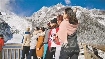圖為游客在海螺溝冰川溫泉度假村拍攝藝術(shù)照。