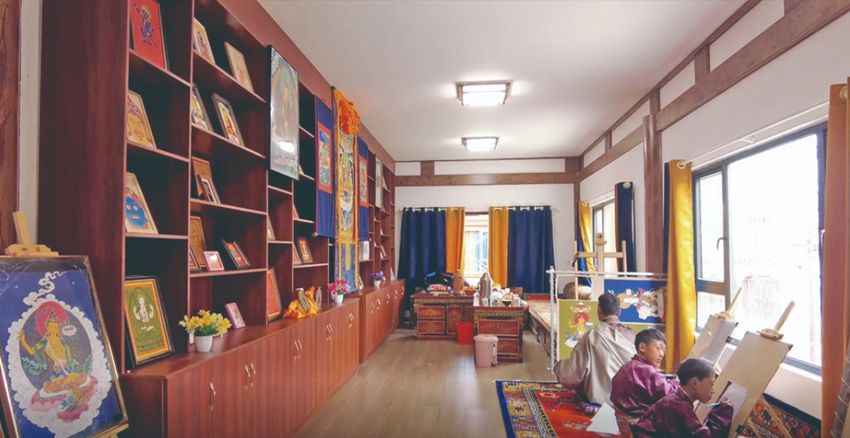 昂旺西繞和徒弟們在畫室繪制唐卡。