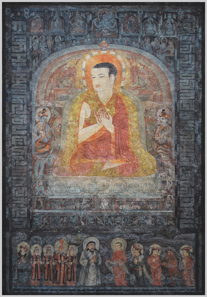 從“三怙主”往兩邊發(fā)展,分別是早期“薩迦五祖”中的前“四祖”:初祖貢噶寧布(1092--1158);二祖索南孜摩(1142--1182),三祖扎巴堅贊(1147--1216),四祖貢噶堅贊(1180--1251),即“薩迦班智達”。而薩迦第五祖就是畫面正中的八思巴(1235--1280)。根據(jù)藏文史料,薩迦五祖中的前三祖稱為“白衣三祖”,因為他們都沒有正式出家受比丘戒,而是身著俗衣以居士身份自居;后二祖稱為“紅衣二祖”,因為他倆正式出家為僧,受過比丘戒,身著紅色袈裟。1253年夏天,忽必烈的軍隊到達六盤山一帶,請八思巴到軍營一敘,雖然有的史書記載之前八思巴就與忽必烈見過面,但這次是八思巴第一次以薩迦教主身份正式會見忽必烈。畫面的下方表現(xiàn)的就是“六盤山相會”的歷史場景。畫面右邊是八思巴一行列隊迎接的場面。中間著紅色吐蕃服裝者即是八思巴,他手捧哈達、神情莊嚴的給忽必烈獻上哈達,紅色吐蕃衣服暗示他當時還未受比丘戒的“紅衣”身份;在他身后哈達搭肩、雙手合十者為其弟恰那多吉,藏青色衣服暗示他的俗人身份;隊列后面是兩位服侍教主的僧侶,他們頭戴吐蕃氈帽、牽馬負笈等候在一旁。左邊是蒙古王族的儀仗隊列,為首便是身著白色裘衣的忽必烈。其后是三個侍女簇擁著的察必王妃,第一位侍女扶著代表皇族的華蓋,而淡青色華蓋說明:忽必烈當時尚未繼承蒙古大汗位。察必王妃和侍女皆穿著紅色的蒙古弘吉剌部落服裝,所不同的是王妃服飾比侍女服飾更顯尊貴和優(yōu)雅;隊伍的最后是一位穿著青衣、佩戴短刀的蒙古侍衛(wèi)。整個蒙古王族隊列面對將來的帝師八思巴,大家都謙遜、虔誠、靜穆地雙手合十致意。忽必烈、察必王妃以及八思巴的形象是根據(jù)古代繪畫作品和文字描述而創(chuàng)作的,服飾、用具、民風民俗也都經(jīng)過仔細的研究考證。畫面兩邊是用“八思巴文”的字母組成的紀念柱,彰顯八思巴創(chuàng)立“蒙古新字”的功勛。受忽必烈指派,八思巴借鑒藏文拼讀方式創(chuàng)制出由41個字母構成的一種新文字,其語音拼讀均按蒙語,又稱“八思巴蒙文”。八思巴向忽必烈呈獻蒙古新字后,忽必烈極為高興,并於1268年下詔,凡是詔書及各地方公文等均必須使用蒙古新字,在全國范圍內(nèi)推行這種新文字。