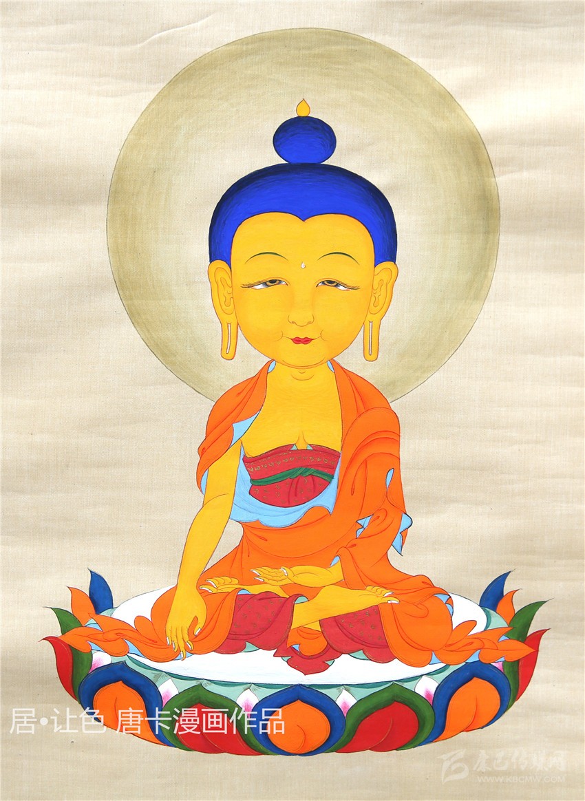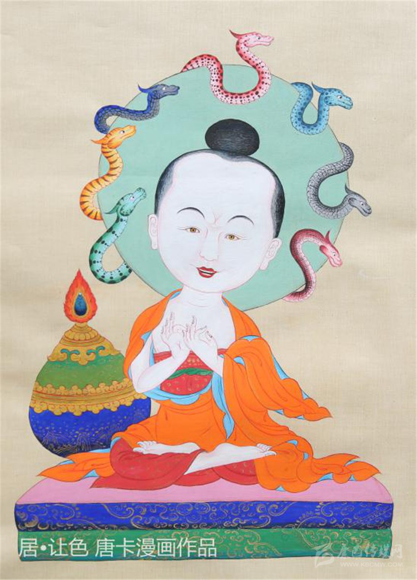 唐卡是藏族最具代表性的藝術(shù)門類之一,在其千年的傳承歷史中吸收融合了印度、尼泊爾等多地的藝術(shù)元素,發(fā)展成為極具雪域特色和審美價值的藝術(shù)形式。傳統(tǒng)唐卡缺乏立體感和形象感,畫面層次模糊,人物形象單薄,不利于民族文化傳承,“對于不懂畫的人來說,這種畫法他們看不懂?!被诖?,居·讓色對唐卡繪畫技法作了改良,結(jié)合現(xiàn)代漫畫,以寫實(shí)的手法,實(shí)現(xiàn)活態(tài)傳承、永續(xù)流傳目的。