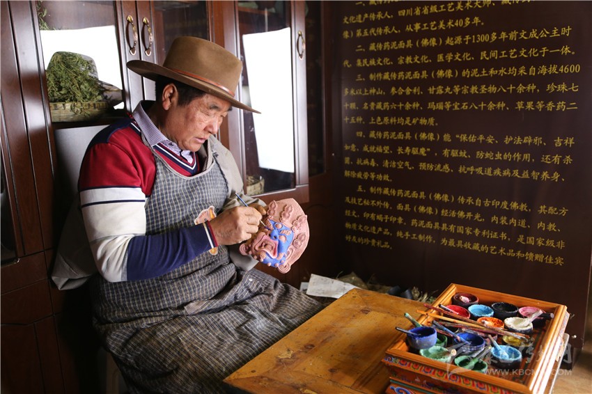 待面具自然風干后,用礦物質、植物的根等制作的自然顏料進行著色,自然顏料有不變色、耐光的特性,通過一淡、二濃、三淡的上色過程使面具涂色均勻,待顏料曬干后對面具進行磨光,去除雜物,再對面具進行裝藏念經,如此,一個藥泥面具制作完成。做好的藥泥面具有濃郁的藥材香氣,并有著驅蚊、殺菌、抗病毒、清潔空氣、解除疲勞等功效。