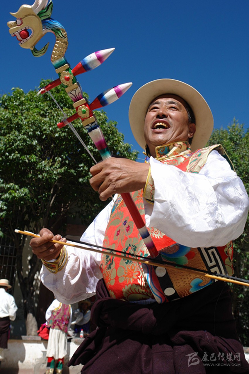 八歲時,就從外婆那里學(xué)會了拉“胡幾”,拉得不好,鄰居們笑:“咿咿呀呀的,像驢子在叫”。人們在田間地角跳弦子時,他夾在圈子里“臊堂子”調(diào)皮,后來便跟著大人跳,跳著跳著就學(xué)會了。有些動作不標(biāo)準(zhǔn),外婆和母親就會笑著糾正。1972年,縣上的“毛澤東思想文藝宣傳隊”選中了剛滿十四歲的他,在“文革”中后期鋪天蓋地的運動中,他們上山下鄉(xiāng)進軍營送文化,弦子舞技得到強化,藏二胡就是在這期間越拉越好的。那時候糧食還沒有過關(guān),公社分配的工分又重,家里的日子過得很艱難。經(jīng)常跟宣傳隊唱唱跳跳,可以不做那些繁重的農(nóng)活了,他還暗地里偷偷慶幸過?!拔母铩苯Y(jié)束后,縣上成立了業(yè)余弦子隊,他自然也在其中,這時,他已經(jīng)能記住二百多首弦子詞曲了。西藏恢復(fù)雪頓節(jié)那年,應(yīng)該是1986年吧,他們又跳到了圣地拉薩,受到了西藏各地官員和群眾的歡迎??途永_的巴塘人在雪頓節(jié)盛典上看到巴塘弦子,流下了激動的淚水,很多人過來跟他們“打招呼”,問候家鄉(xiāng)人。跳弦子五十多年,去拉薩應(yīng)該是最難忘的事情了?!鞍桌瓫_!說拉薩道拉薩,拉薩建在海面上。”這是小時候外婆教他唱的。和所有的藏族一樣,他從小就向往那塊圣地。八十年代交通極其不方便,去成都都要走整整四天,去拉薩多難啊,所以村里人都很羨慕他們弦子隊。他還記得,在向布達拉宮虔身朝拜的那一刻,他流下了感動和幸福的淚水。