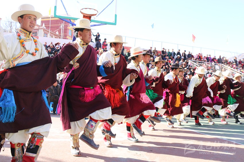弦子比賽開始了。精神矍鑠,頭戴紅須“嗦啊”的扎西第一個出場。白色“仙子”(藏式襯衫)的長袖一層層疊到手腕,藍緞子藏式背心在陽光的映襯下,顯得格外光亮耀眼。一把彩色弦胡抵在左腰,左手幾個指姆在馬尾琴弦上靈動地起落按擦,右手輕松自如地拉動琴弓,琴弦伸縮間,琴筒里發(fā)出悠揚的弦子聲。他扯開嗓子起音,聲音宏亮,身后十一個胡琴手齊拉共唱,后面一百多位著盛裝的男女舞者動作整齊劃一,一個回環(huán)往復(fù)的圓圈逐漸形成,原生態(tài)歌聲化漾開去,從廣場的四面八方升騰起來,在天際飄蕩: