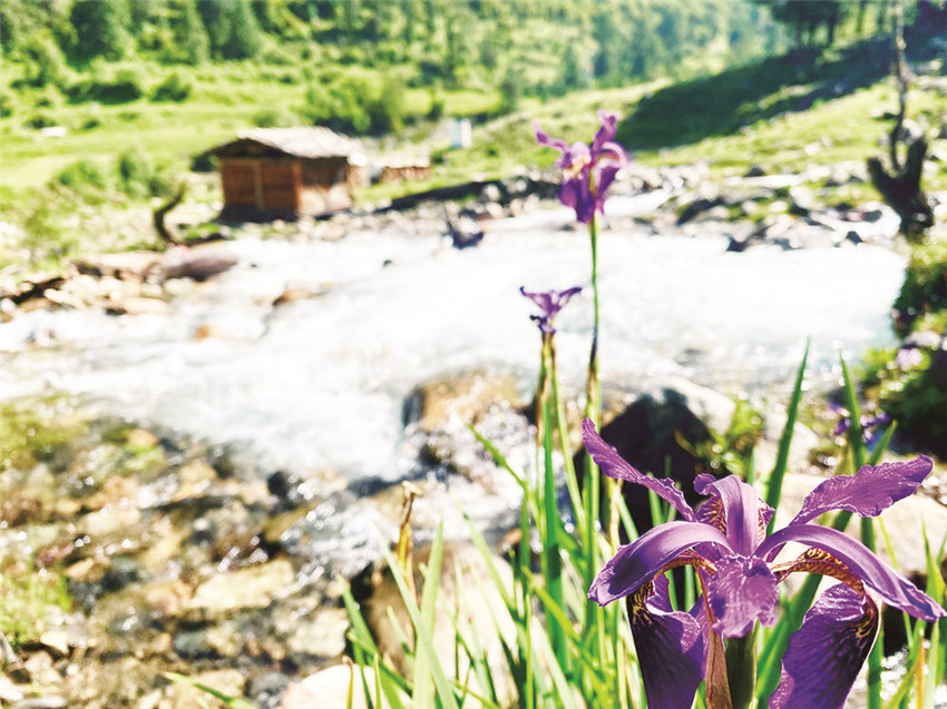 我走出木屋,朝著流動的水聲去梳洗。三兩只藍綠色的鳥兒立在插入溪水溝里的一截木槽上低頭飲水,抬頭鳴唱,見到人影,撲棱棱幾聲飛進了不遠處的一片淺樹叢里,沒了蹤跡。一層薄薄的白霧正從牧場后方皺褶起伏的山頂漫溢下來,湮沒了黛青色的山石、綠色的小杜鵑樹叢,接著湮沒了整個牧場,眼前一片空茫,耳邊只有溪水婉轉(zhuǎn)流向遠處的聲音。我蹲下身,把手伸進溪水里,由雪水融化的沁涼很快冷冽到了骨頭里,再往深處,觸摸到一個個光滑的圓石。浸泡久了,溪水開始變得柔軟溫暖起來,掬一捧洗臉,那清爽仿佛能使我一眼看開眼前的云霧,看清那些停立于山頂石礫之上的灰色獐子和樹叢深處悄然綻開的紫色貝母花,花瓣上星星點點的白是它與生俱來的喜色。