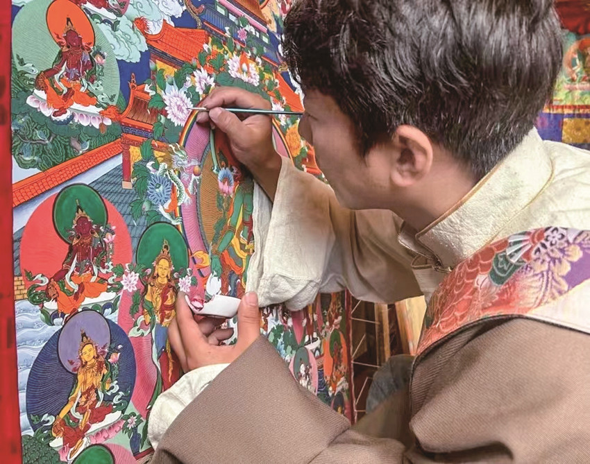 “唐卡作為中國民族繪畫藝術的珍品,不僅呈現(xiàn)精湛的技藝和美學,更是傳遞一種文化?!睏畹潜硎荆鳛橐幻h級非遺傳承人,要在繼承傳統(tǒng)技藝的基礎上,采用多元藝術技藝賦予傳統(tǒng)唐卡更多創(chuàng)意,讓民族文化瑰寶能夠更好地發(fā)揚光大。