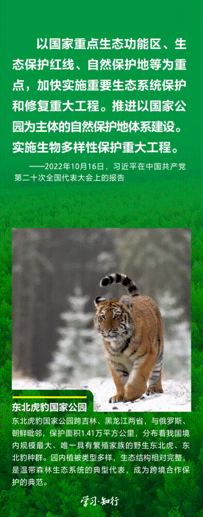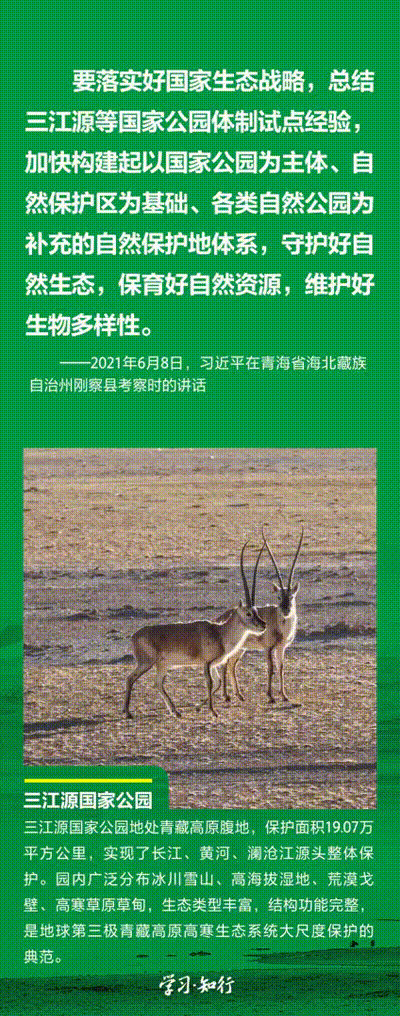 “生物多樣性使地球充滿生機(jī),也是人類(lèi)生存和發(fā)展的基礎(chǔ)?!蓖七M(jìn)以國(guó)家公園為主體的自然保護(hù)地體系建設(shè),是習(xí)近平總書(shū)記作出的重要部署。三江源、大熊貓、東北虎豹、海南熱帶雨林、武夷山等首批國(guó)家公園正式設(shè)立以來(lái),生態(tài)功能持續(xù)向好,對(duì)保護(hù)生物多樣性、推進(jìn)人與自然和諧共生的現(xiàn)代化具有重要意義。