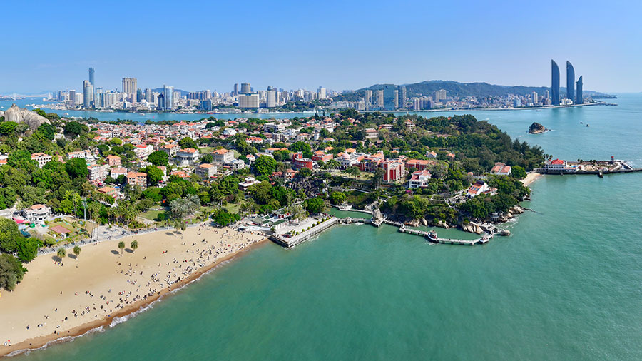 ??游人在廈門鼓浪嶼沙灘上游玩(無人機(jī)照片)。新華社記者 姜克紅 攝