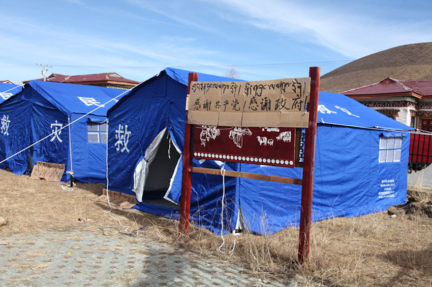 塔公鄉(xiāng)塔公村黨員服務(wù)隊(duì)在支書張東升的帶領(lǐng)下為災(zāi)民搭建帳篷。