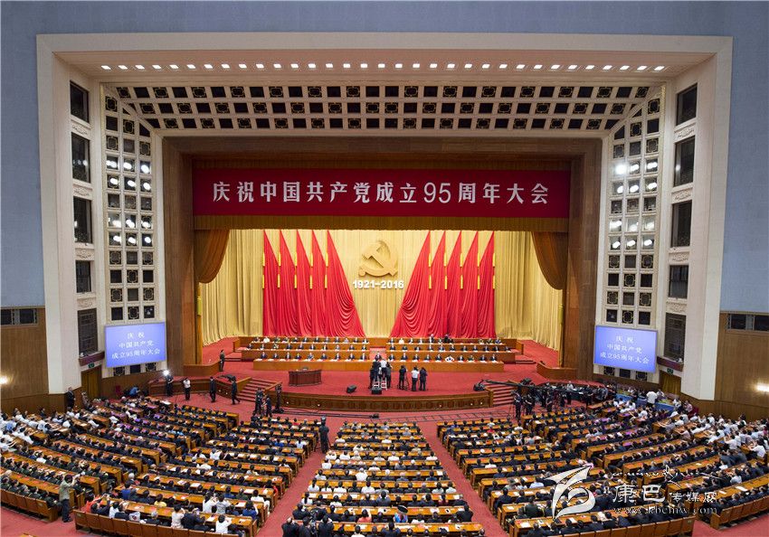 人民大會(huì)堂雄偉莊嚴(yán),萬(wàn)人大禮堂燈火輝煌。主席臺(tái)上方懸掛著“慶祝中國(guó)共產(chǎn)黨成立95周年大會(huì)”會(huì)標(biāo)。帷幕正中,由鐮刀和錘頭組成的中國(guó)共產(chǎn)黨黨徽在十面紅旗映襯下熠熠生輝,“1921-2016”字樣格外醒目。大禮堂二層眺臺(tái)懸掛橫幅:緊密團(tuán)結(jié)在以習(xí)近平同志為總書記的黨中央周圍,銳意進(jìn)取、開拓創(chuàng)新,全面推進(jìn)黨的建設(shè)新的偉大工程,為實(shí)現(xiàn)“兩個(gè)一百年”奮斗目標(biāo)、實(shí)現(xiàn)中華民族偉大復(fù)興的中國(guó)夢(mèng)而努力奮斗!