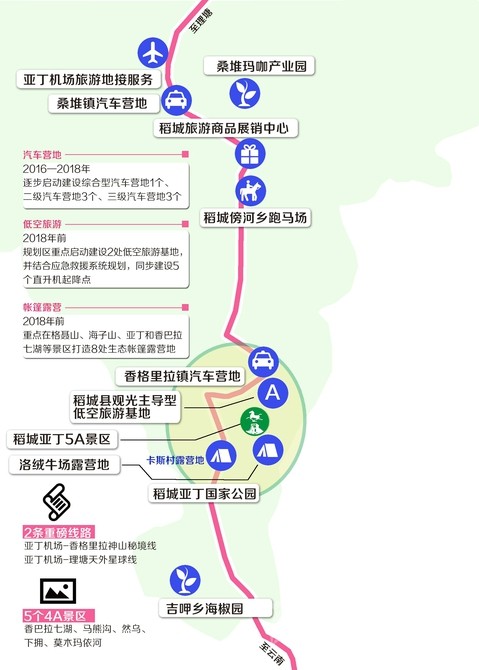 根據(jù)《規(guī)劃》,將結(jié)合道路交通和旅游景區(qū)景點分布,2016—2018年,逐步啟動建設(shè)綜合型汽車營地1個、二級汽車營地3個、三級汽車營地3個,作為建設(shè)環(huán)亞丁兩小時旅游圈的重要旅游項目,滿足日益增長的自駕車游客需求。