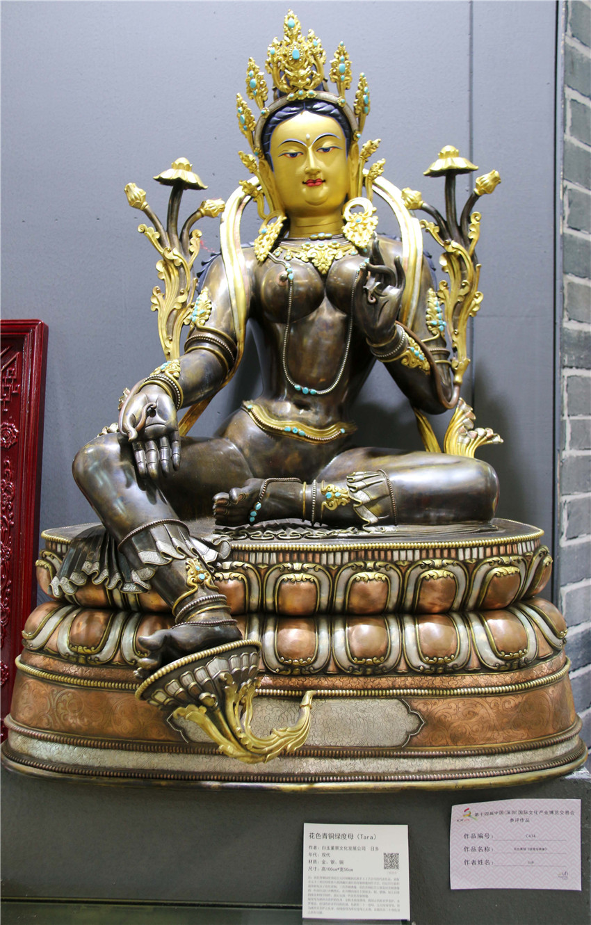 本網(wǎng)訊(記者 宋志勇 文/圖)“這是由什么材料鑄成的物件?”“這件作品的寓意是什么?”“這是一件花色青銅《綠度母佛像》,分別由金、銀、銅鑄成,高100cm、寬50cm,綠度母為觀世音菩薩的化身。”5月12日是第十四屆中國(guó)(深圳)國(guó)際文化產(chǎn)業(yè)博覽交易會(huì)第三天,甘孜展館迎來(lái)了眾多參觀者,在館內(nèi)市民正與白玉縣董察文化發(fā)展有限責(zé)任公司董事長(zhǎng)日多一問(wèn)一答。