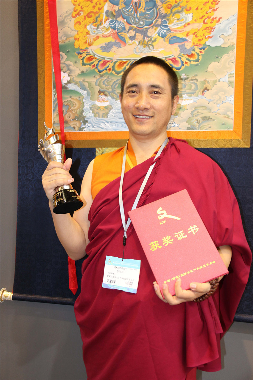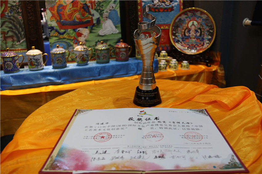據(jù)了解,在本次深圳文博會上,我州參加十四屆深圳文博會參賽展品中有10件工藝品獲獎。其中,白玉縣董察文化公司參展作品首當(dāng)其沖獲得工藝美術(shù)文化創(chuàng)意金獎。爐霍縣珍馬文化藝術(shù)公司、爐霍縣華彩文化傳播有限公司、白玉縣河坡藏民族手工藝公司、新龍藥泥面具分別獲得工藝美術(shù)文化創(chuàng)意銀獎;德格縣多普溝噶瑪噶孜文化旅游公司、甘孜州郎卡杰唐卡有限公司、丹巴木版畫、康體書法、德格絳紅天堂文化旅游公司分別獲得工藝美術(shù)文化創(chuàng)意銅獎。同時,州文體廣新局和康巴文化研究院獲優(yōu)秀組織獎;甘孜州全境文化產(chǎn)業(yè)有限發(fā)展公司和康巴聚慧文化傳播有限公司獲得優(yōu)秀展示獎。其它參展商均獲得本屆文博會優(yōu)秀入圍獎。國家一級手工藝美術(shù)大師、爐霍縣華彩文化傳播有限公司馮建華:“這一次是我公司第一次在文博會上參展,就榮獲銀獎,這要感謝黨委政府和文化部門提供的平臺。相信在此基礎(chǔ)上狠下功夫,越做越好,將陶瓷藝術(shù)與唐卡藝術(shù)很好的發(fā)揚光大。”