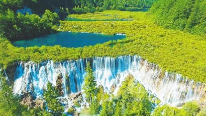 重建實踐彰顯生態(tài)理念——九寨溝景區(qū)內(nèi),尊重自然、綠色修復的舉措不勝枚舉。地震后,諾日朗瀑布出現(xiàn)一條16.8米長的裂縫,僅剩一股急流。景區(qū)就地取材,用地震中垮塌的鈣化物來填補“漏水”的裂縫,豐水期時,諾日朗瀑布恢復了昔日壯觀景象。