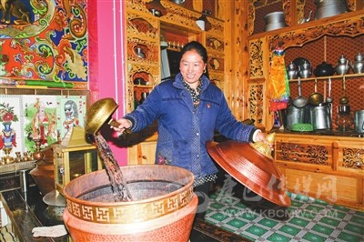 寬敞的院壩,卵石鋪就的花臺(tái)花開(kāi)爭(zhēng)艷,獨(dú)立的衛(wèi)生間和廚房里,現(xiàn)代廚衛(wèi)一樣不缺,三個(gè)冰柜擺滿了食品,燒烤爐擺在廚房一角。走進(jìn)頂真的客廳,55吋的液晶電視,造型典雅別致的碗柜,琳瑯滿目的各式器皿,藏桌上擺滿了水果和飲料。坐在“豪華”的客廳里,頂真幸福開(kāi)懷。