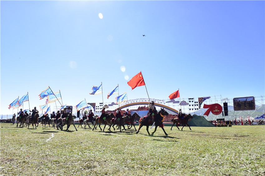“四山旗似晴霞卷,萬(wàn)馬蹄如驟雨來(lái)”。上午十點(diǎn),石渠縣四個(gè)片區(qū)組成的四個(gè)馬隊(duì)方陣高舉印有“世界最美濕地”“千年唐蕃古道”“石刻藝術(shù)王國(guó)”“吉祥太陽(yáng)部落”字樣的四色彩旗,眾星拱月般簇?fù)碇腥A人民共和國(guó)國(guó)旗和慶祝中華人民共和國(guó)成立70周年活動(dòng)標(biāo)識(shí),策馬入場(chǎng),拉開了2019中國(guó)·石渠—太陽(yáng)部落帳篷狂歡節(jié)的帷幕。