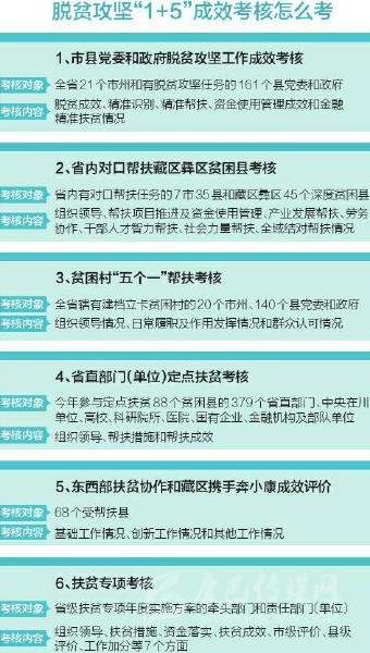 如何考?省扶貧開發(fā)局相關(guān)負責(zé)人介紹,具體而言,就是將黨委和政府脫貧攻堅工作成效考核、省直部門(單位)定點扶貧考核、扶貧專項考核、省內(nèi)對口幫扶藏區(qū)彝區(qū)貧困縣考核、貧困村“五個一”幫扶考核、東西部扶貧協(xié)作和藏區(qū)攜手奔小康成效評價統(tǒng)一整合為脫貧攻堅成效考核,一支隊伍完成所有考核。