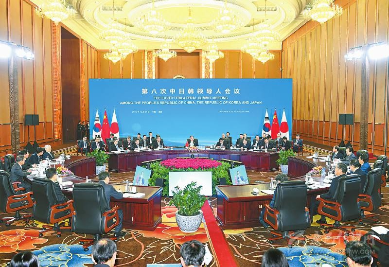 十二月二十四日,國(guó)務(wù)院總理李克強(qiáng)在成都與韓國(guó)總統(tǒng)文在寅、日本首相安倍晉三共同出席第八次中日韓領(lǐng)導(dǎo)人會(huì)議。新華社記者 張領(lǐng) 攝