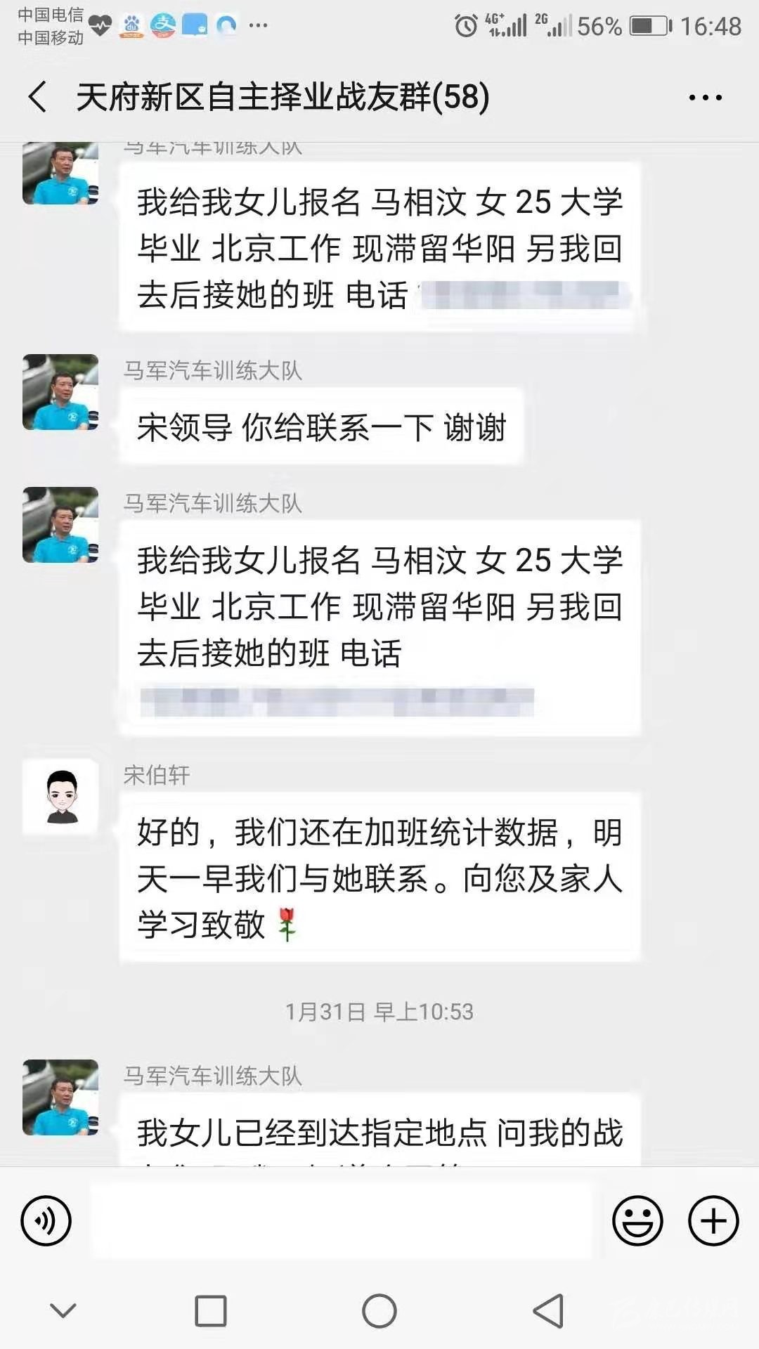 “我給我女兒報名,馬相汶,女,25歲,大學(xué)畢業(yè),北京工作,現(xiàn)滯留成都,另我回去后接她的班。”近日,一條微信截圖傳遍了天府新區(qū)退役軍人的朋友圈。