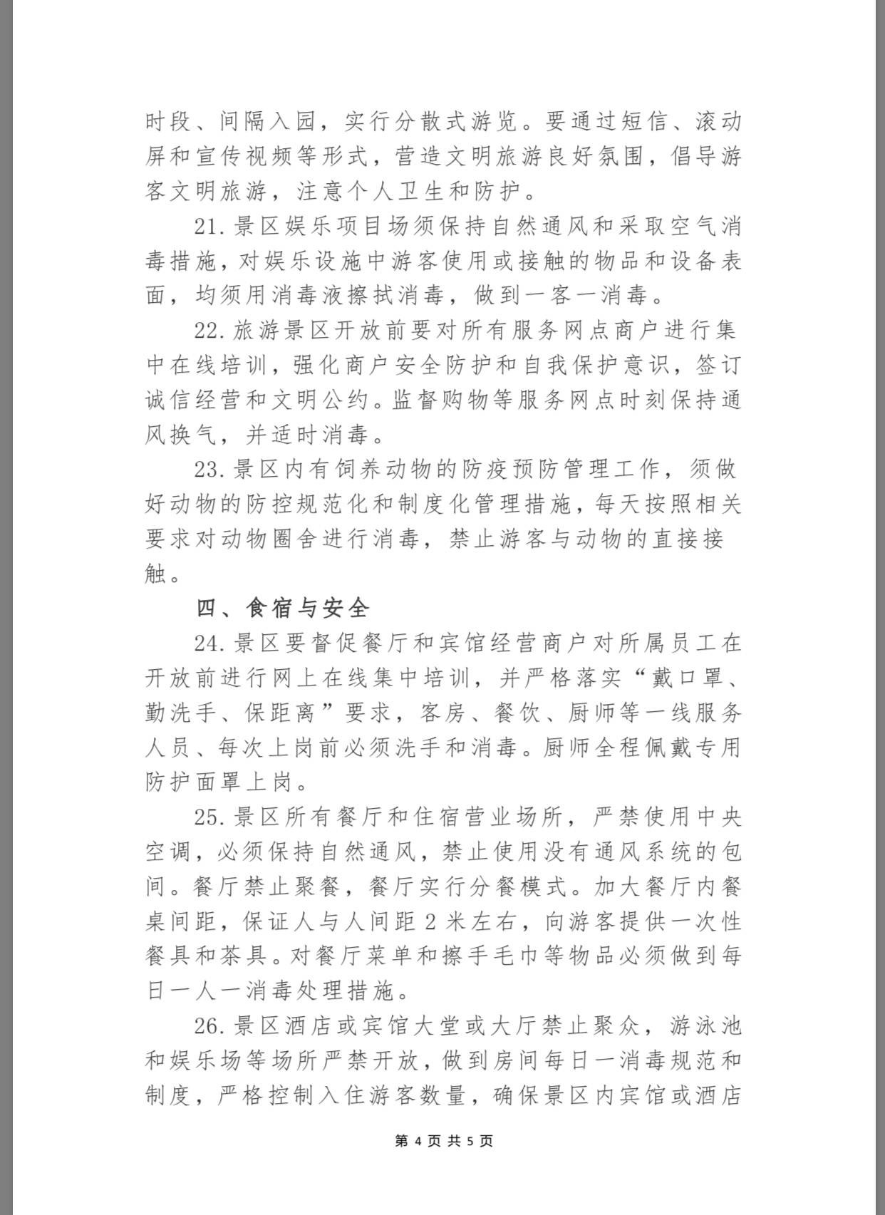 出游時的食宿安全至關(guān)重要?!吨改稀诽岢?,除了日常消毒,景區(qū)要督促餐廳和賓館經(jīng)營商戶對所屬員工在開放前進(jìn)行網(wǎng)上在線集中培訓(xùn),景區(qū)餐廳嚴(yán)禁提供以野生動物為原料的菜品,對餐廳后廚供應(yīng)商實行非接觸性配送,建立供應(yīng)單位送貨人員的實名健康登記制度。用餐時,禁止聚餐,餐廳實行分餐模式,加大餐廳內(nèi)餐桌間距,保證人與人間距2米左右,向游客提供一次性餐具和茶具。景區(qū)酒店或賓館大堂或大廳禁止聚眾,游泳池和娛樂場等場所嚴(yán)禁開放。