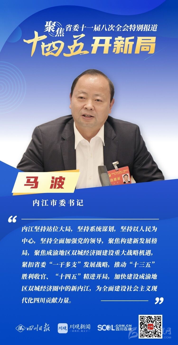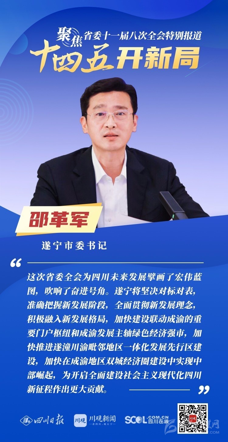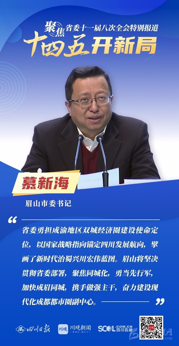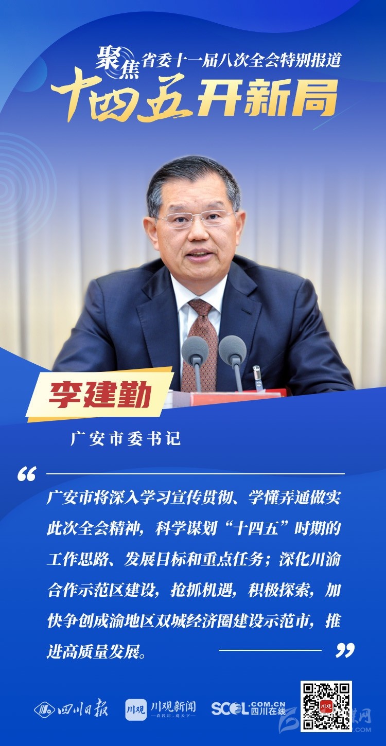 12月3日,中共四川省委十一屆八次全會在成都開幕,全會將深入學習貫徹黨的十九屆五中全會精神,審議《中共四川省委關(guān)于制定四川省國民經(jīng)濟和社會發(fā)展第十四個五年規(guī)劃和二〇三五年遠景目標的建議(討論稿)》,為未來5年乃至更長時期四川發(fā)展謀劃新藍圖 。