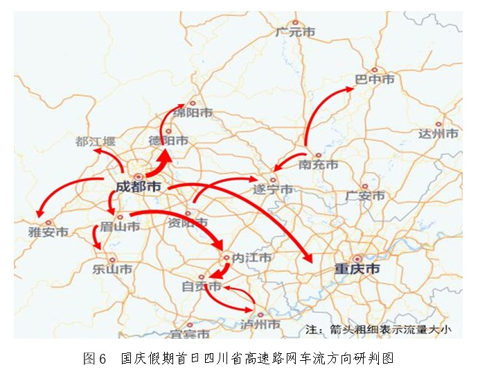 預(yù)計車流量主要圍繞成都等中心城市呈放射狀分布。節(jié)日期間,成都市周邊各主線站以及連通主線站的環(huán)線高速車流量最為密集,假期出行主要方向集中在成都往德陽、眉山往內(nèi)江、內(nèi)江往自貢、成都往雅安、成都往都江堰以及成都往重慶方向。