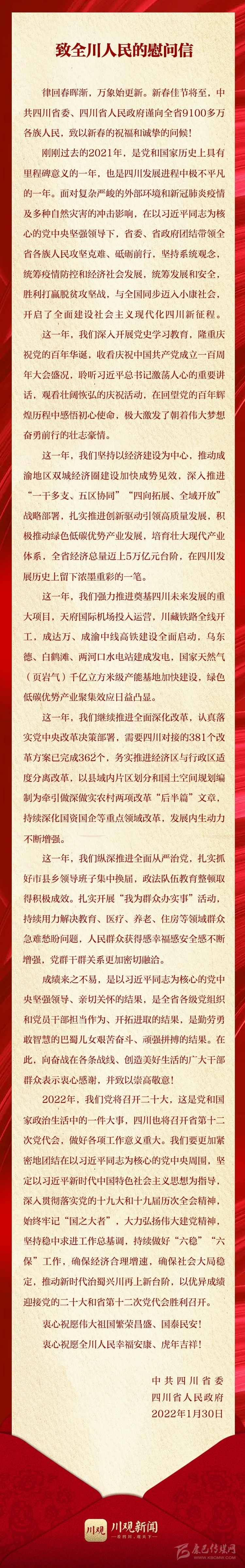 新春佳節(jié)將至,中共四川省委、四川省人民政府發(fā)出慰問信,向全省9100多萬各族人民,致以新春的祝福和誠摯的問候!衷心祝愿?jìng)ゴ笞鎳睒s昌盛、國泰民安!衷心祝愿全川人民幸福安康、虎年吉祥!