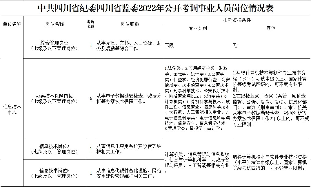 符合報(bào)考崗位規(guī)定的資格條件,詳見《中共四川省紀(jì)委四川省監(jiān)委2022年公開考調(diào)事業(yè)人員崗位情況表》(附后)。