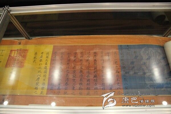 據(jù)介紹,明成祖永樂十一年封誥為國家一級文物,系明永樂帝成祖朱棣于明永樂十一年(1413)敕封噶瑪噶舉楚布寺第二世司徒活佛曲吉降村為“灌頂圓通妙濟(jì)國師”時頒賜的。該封誥質(zhì)地為宮廷誥文專用彩色云綾紋錦,由藍(lán)、明黃、白、灰、褐五色錦帛分段依次裱接為手卷形制。封誥用漢藏兩種文字墨書,漢文居右、直行,共20行、145字、楷書;藏文居左、橫行、共四行、行書。封誥右藍(lán)色錦帛織二龍及“奉天誥命”四字。該封誥真實地記載了明王朝敕封噶瑪噶舉派高僧,有效管理藏區(qū)地方事務(wù)的史實,對研究明代中央王朝與藏區(qū)關(guān)系具有重要的史料價值。
