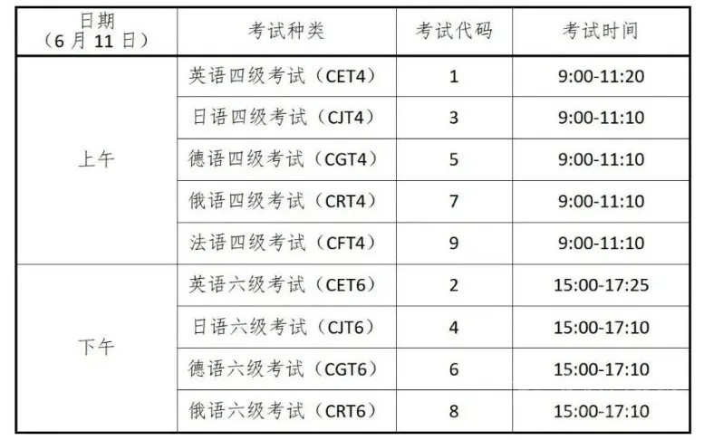 CET考試時間為6月11日,開考科目為英語、日語、德語和俄語4個語種的四級和六級,法語四級。具體場次安排如下: