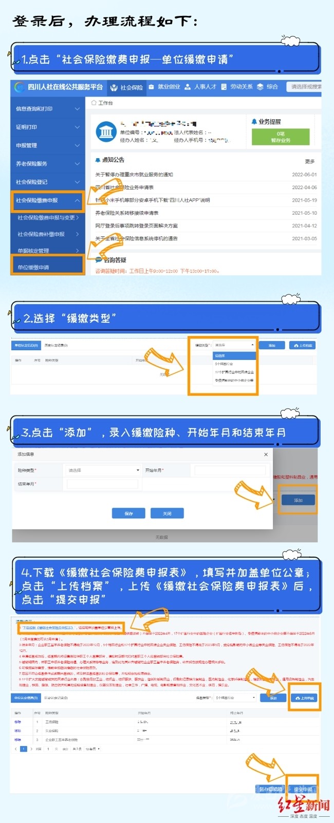 7月26日,紅星新聞?dòng)浾邚某啥际腥松缇肢@悉,今年6月,四川省人社廳、省發(fā)改委、省財(cái)政廳、省稅務(wù)局聯(lián)合出臺(tái)的《關(guān)于擴(kuò)大階段性緩繳社會(huì)保險(xiǎn)費(fèi)政策實(shí)施范圍等問題的通知》,明確了延長階段性減免企業(yè)基本養(yǎng)老保險(xiǎn)、失業(yè)保險(xiǎn)、工傷保險(xiǎn)單位繳費(fèi)政策實(shí)施期限,同時(shí)將階段性緩繳社會(huì)保險(xiǎn)費(fèi)政策擴(kuò)圍至22個(gè)行業(yè)。
