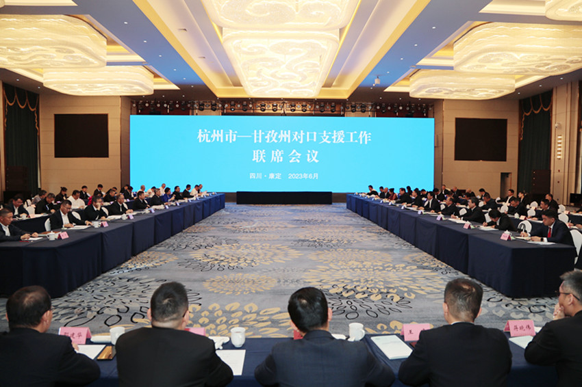 杭州市——甘孜州對(duì)口支援工作聯(lián)席會(huì)議現(xiàn)場(chǎng)。