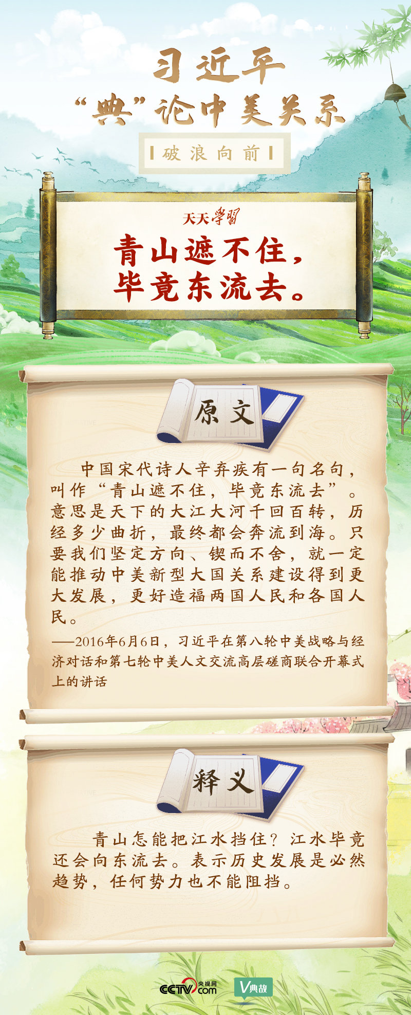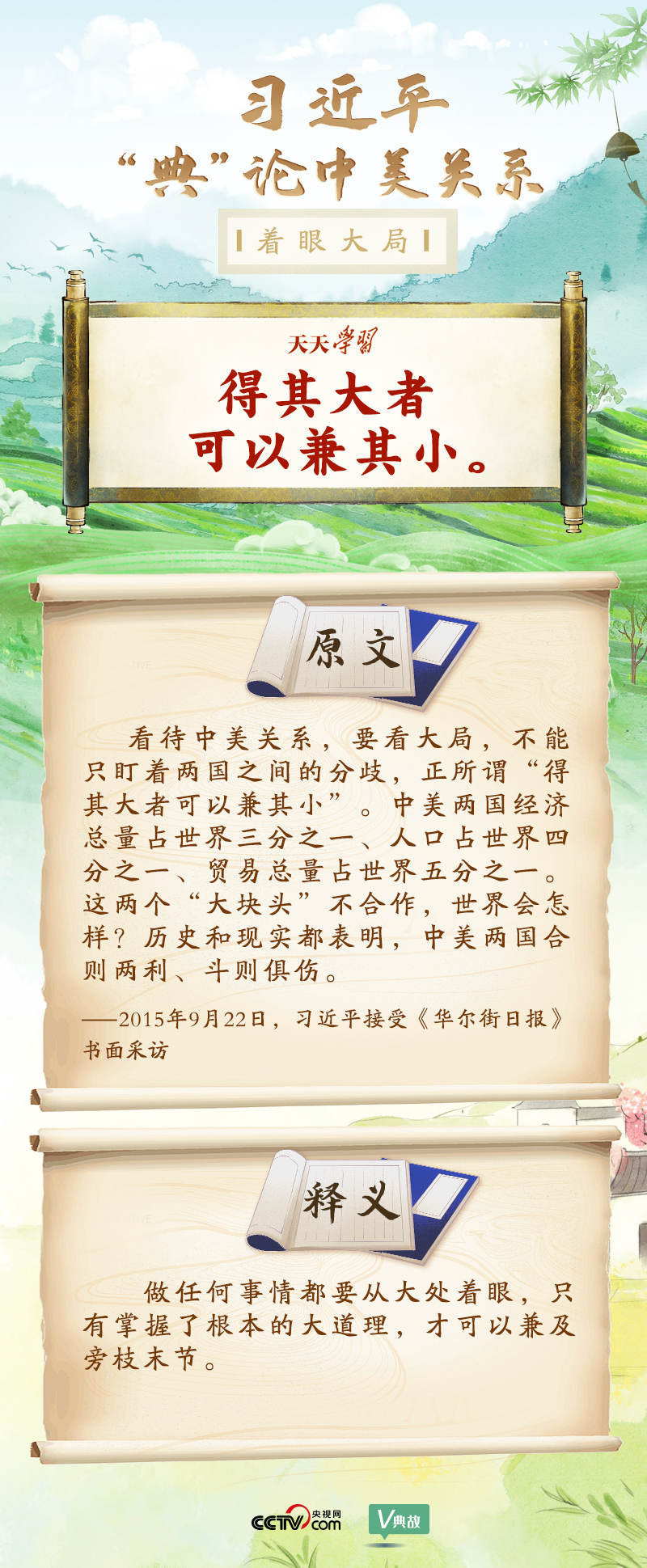 黨的十八大以來,習近平主席就中美關系發(fā)表了一系列重要講話。他站在時代高度分析、研判中美關系現(xiàn)狀及發(fā)展趨勢,并引經(jīng)據(jù)典為發(fā)展中美關系指出正確方向。這些論述蘊含深刻的戰(zhàn)略思維和政治智慧,具有重大現(xiàn)實意義和深遠歷史意義。央視網(wǎng)《天天學習》與您一起深刻領會。