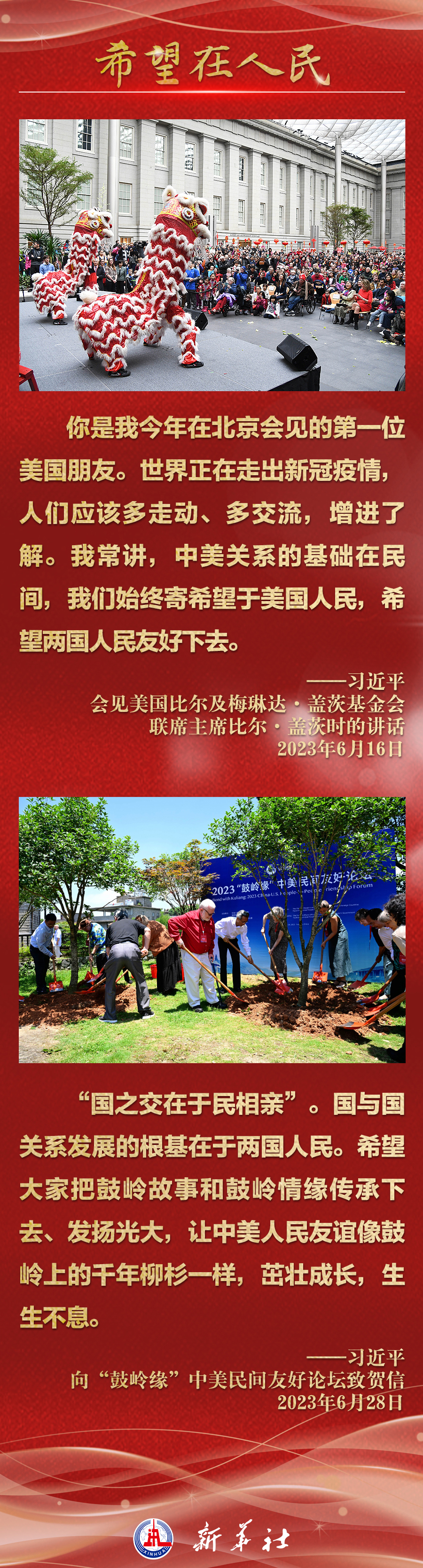 今年以來,從在京會見美國各界人士,到向“鼓嶺緣”中美民間友好論壇等活動致賀信,再到復(fù)信美國華盛頓州“美中青少年學(xué)生交流協(xié)會”、史迪威將軍后人、飛虎隊老兵等友好人士,習(xí)近平主席同美國各界真摯互動,強調(diào)中美關(guān)系基礎(chǔ)在民間,希望在人民,未來在青年,活力在地方。