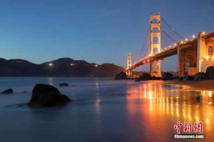 當?shù)貢r間10月29日,美國舊金山金門大橋在海浪和夜色的襯托下美如一幅畫。中新社記者 劉關(guān)關(guān) 攝