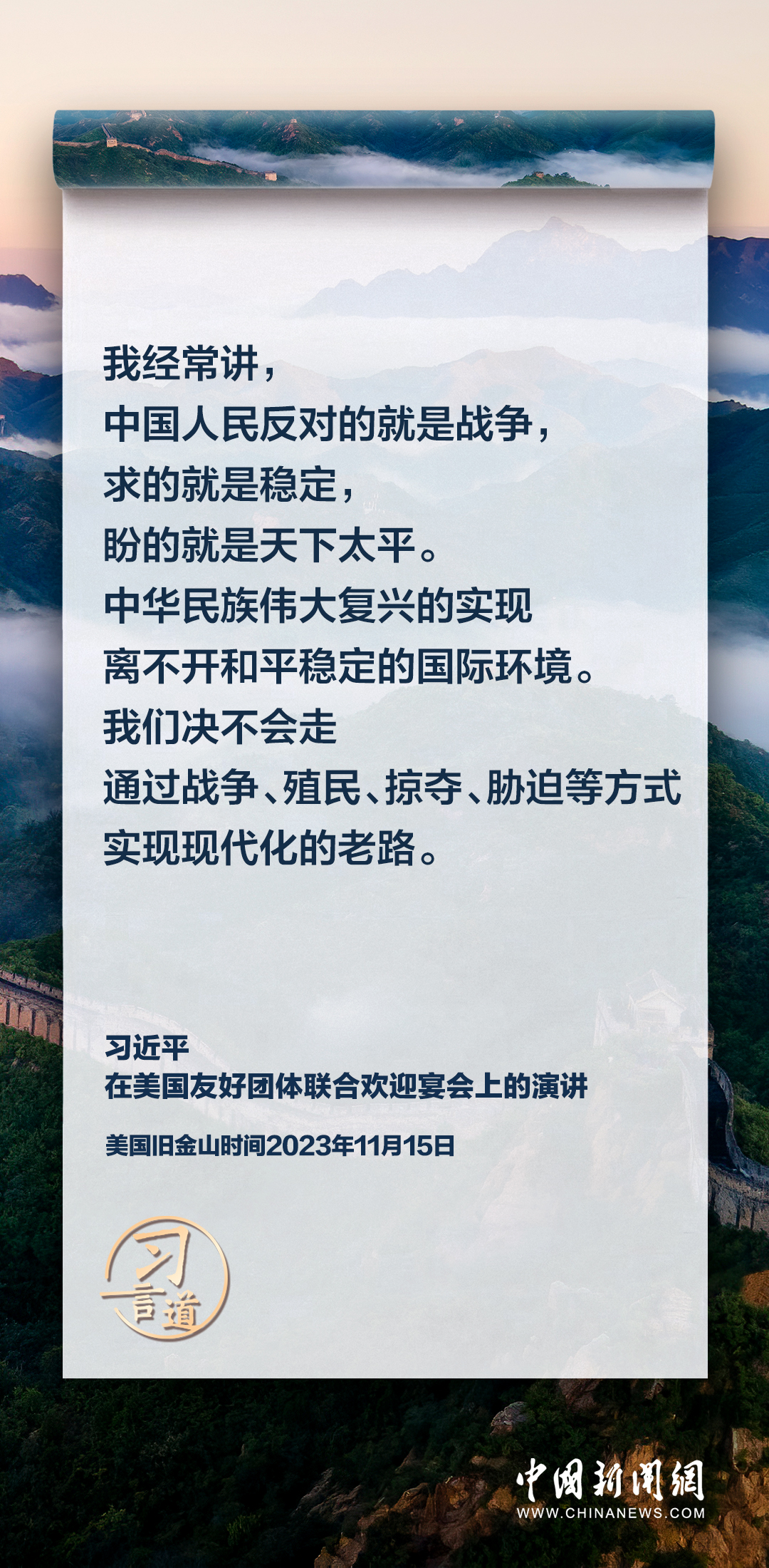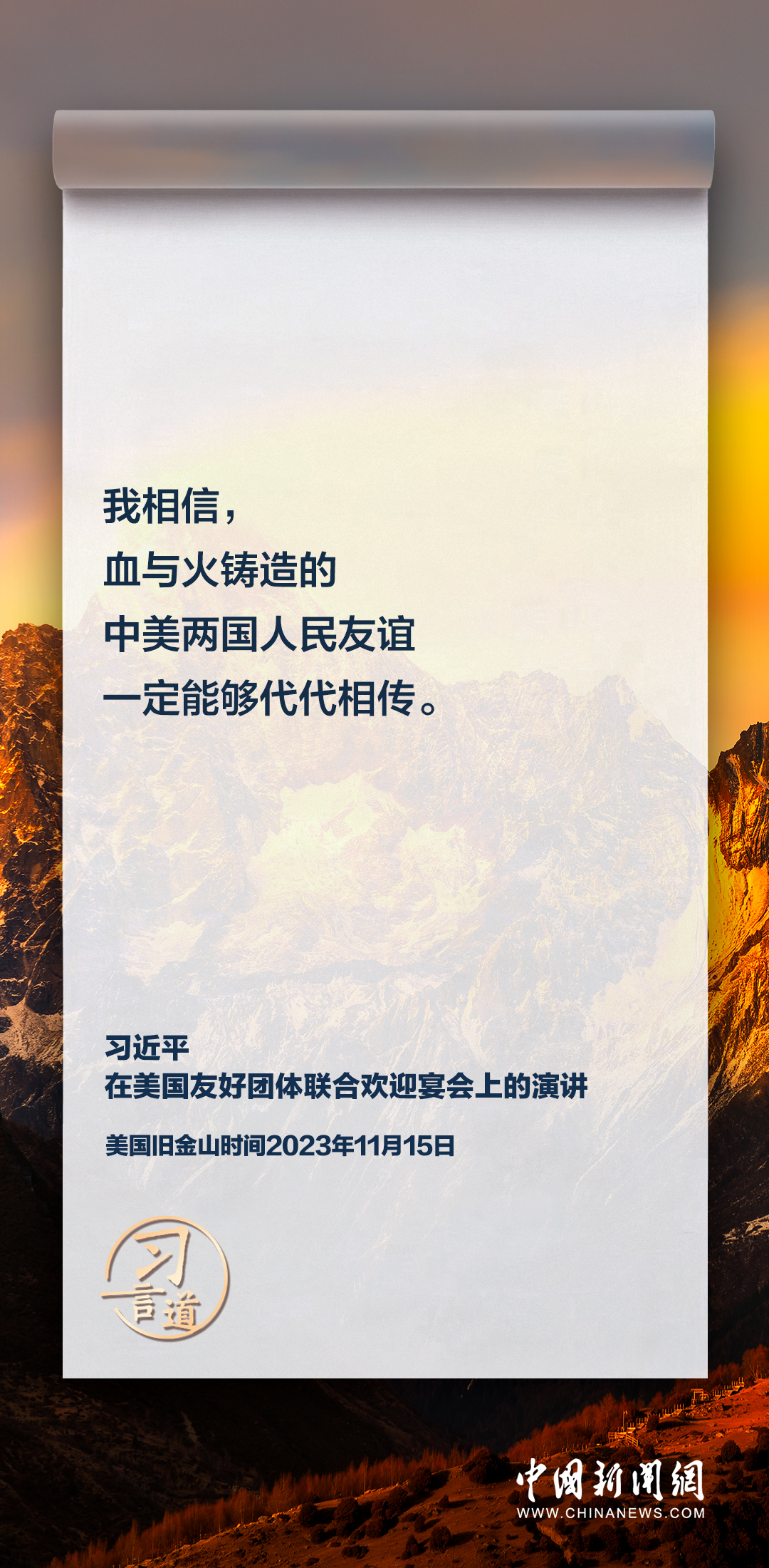 當(dāng)?shù)貢r(shí)間11月15日,中國國家主席習(xí)近平在美國舊金山出席美國友好團(tuán)體聯(lián)合歡迎宴會(huì)并發(fā)表演講。習(xí)近平在演講中從“我”和“我們”說起,提出中國主張、表明中國立場(chǎng)、展現(xiàn)大國擔(dān)當(dāng),話語擲地有聲。