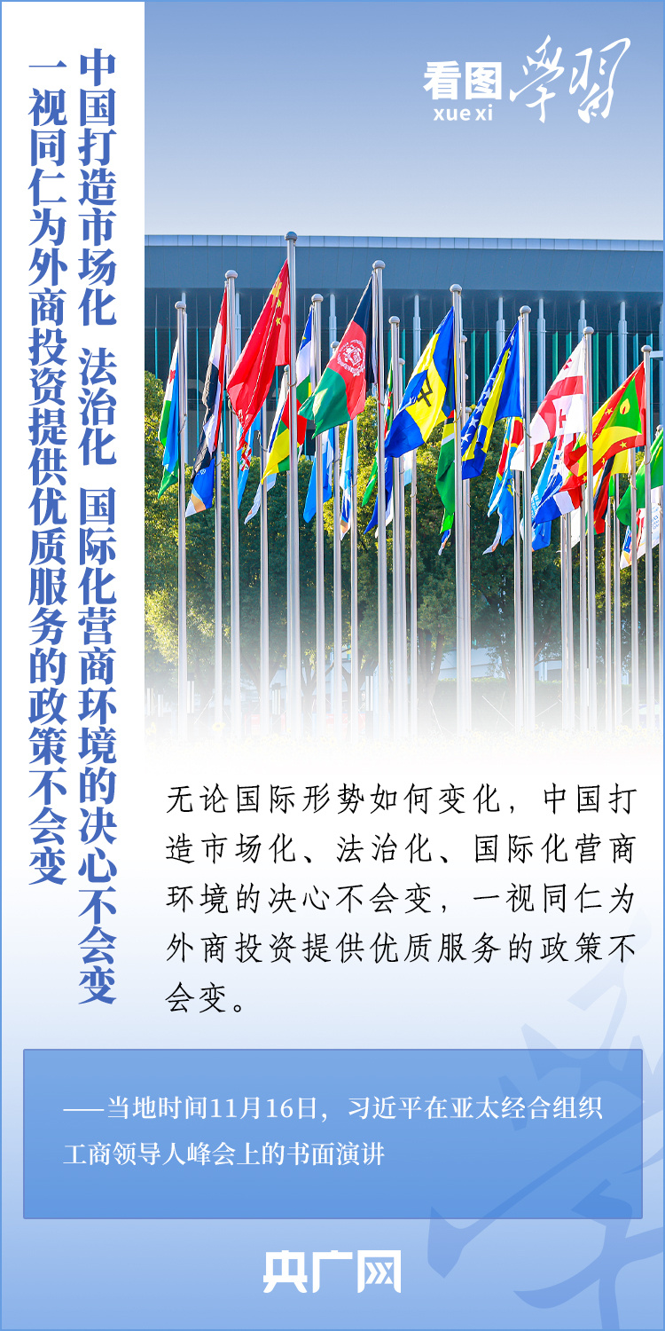 當?shù)貢r間11月16日,國家主席習近平應邀出席亞太經(jīng)合組織工商領導人峰會并發(fā)表書面演講。習主席深刻總結了亞太經(jīng)濟合作30年來非凡成就和啟示,對亞太合作下一個30年將走向何方這一新的時代之問提出中國答案,重申“中國打造市場化、法治化、國際化營商環(huán)境的決心不會變,一視同仁為外商投資提供優(yōu)質(zhì)服務的政策不會變”,向全球工商界發(fā)出邀請,歡迎“積極參與中國式現(xiàn)代化進程,共享中國高質(zhì)量發(fā)展帶來的巨大機遇!”一起來學習。
