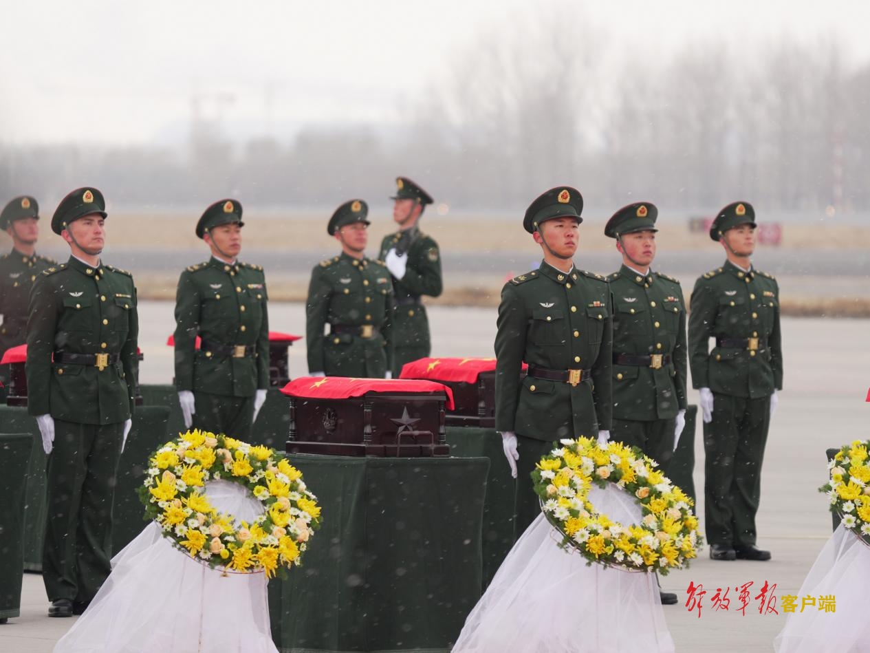 雪花飛舞間,《義勇軍進行曲》的鏗鏘旋律響起。擔負此次司禮演奏任務的武警北京總隊軍樂團已是第六次接志愿軍烈士回家??粗\-20專機緩慢降落,演奏員吳鐘又一次感受到肩上所背負的使命——作為英雄踏上故土聽到的第一首樂曲,這是國的召喚,更是家的慰藉。
